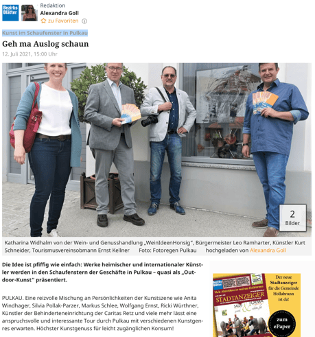 Die Idee ist pfiffig wie einfach: Werke heimischer und internationaler Künstler werden in den Schaufenstern der Geschäfte in Pulkau – quasi als „Outdoor-Kunst“ präsentiert.